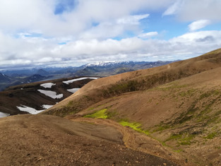 9h30 départ, ça monte direct un peu, puis un paysage s'ouvre, c'est magnifique ça donne envie de s'emballer direct, mais il faut se freiner. Je m'étais dit que je ne ferai pas de photos, mais c'est trop magnifique, je m'arrête par moment pour en faire quelques-unes, tant pis pour le temps. Ça continue de monter et au bout d'un moment on a de plus en plus de neige, par endroit des ruisseaux d'eau chaude diffusent de la vapeur et une odeur de soufre.